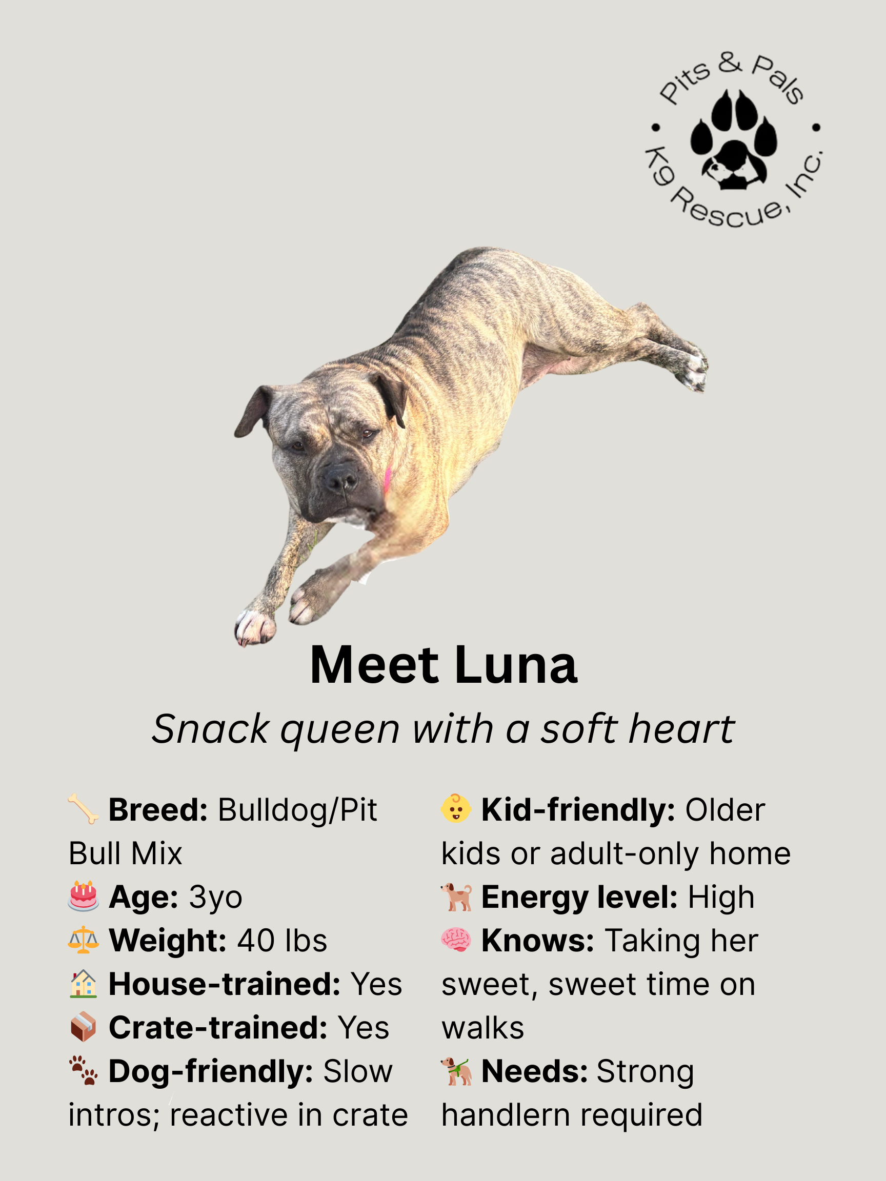 I’m a 3-year-old bulldog/pit mix with short legs, a soft heart, and a very serious love for snacks. Blueberries? Yes please. Strawberries? Even better. I’m around 42 pounds, but don’t let that fool you—I’ll absolutely try to fit in your lap for a proper cuddle session.